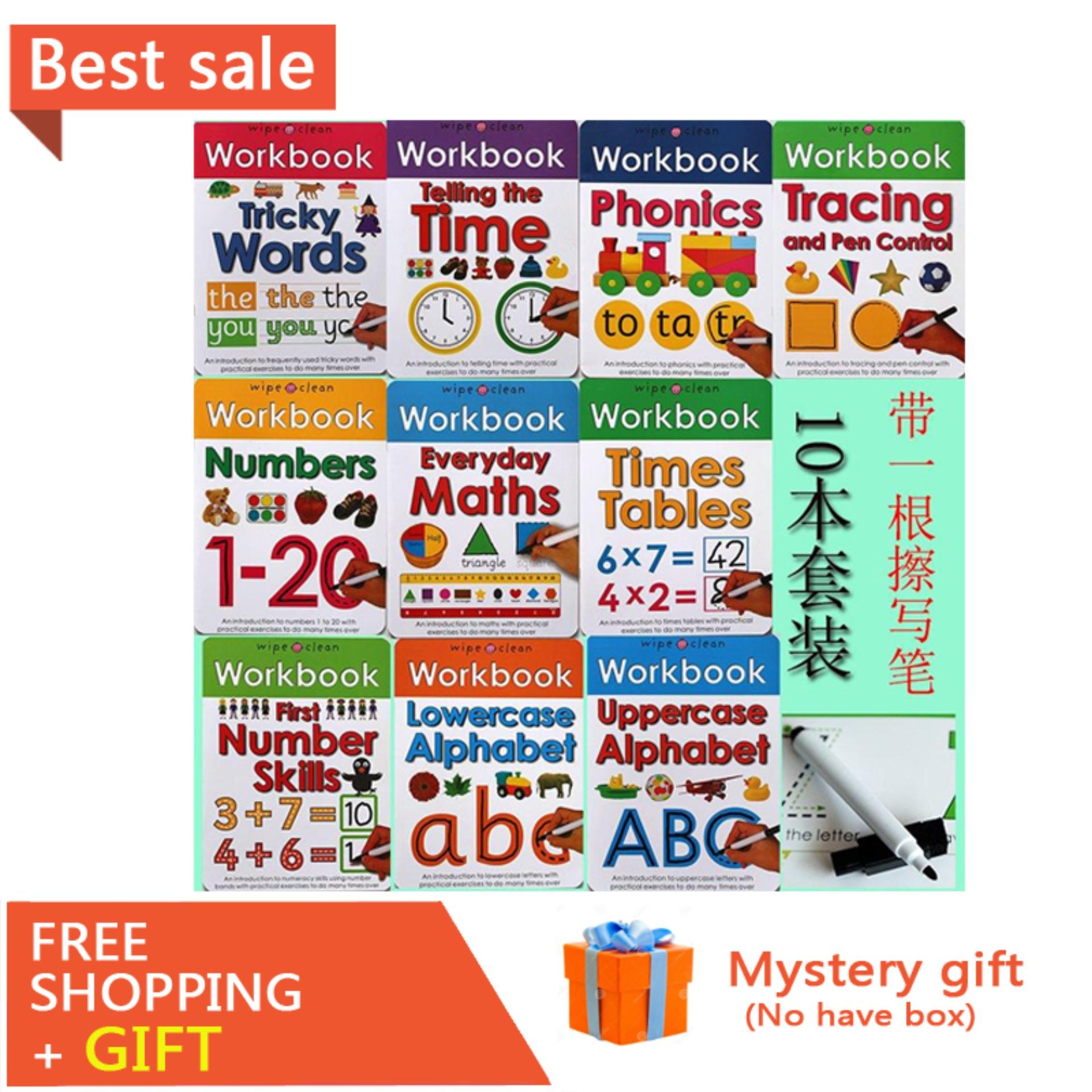 10books Set Wipe Clean Workbook Children English Writing Book Times Tables Maths Number Skill Tricky Phonics Words Alphatbet Abc